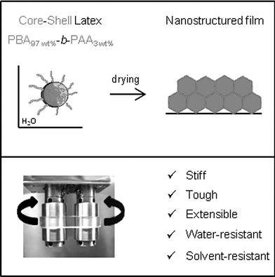 According to the polymerization-induced self-assembly (PISA) approach, well-defined amphiphilic PAA-b-PBA diblock copolymers form and self-assemble during synthesis to yield highly stable core-shell particles with an extremely thin hard PAA shell. For the first time, we report here the specific properties of films obtained from these particular latexes. After drying the aqueous dispersion, tough and transparent films are obtained. Although the films are not chemically cross-linked, they do not dissolve in good solvents for PBA. Moreover, they remain transparent even after immersion in water. Rheology shows that the films are both stiff and ductile, thanks to the nanostructured but very low volume fraction (less than 3 wt%) of PAA forming a percolating network in the soft PBA. Compared with conventional core-shell-based films, this approach affords for the first time a route to a thin percolating honeycomb nanostructure with a sharp and strong interface between the two phases. The versatility of the synthetic procedure opens perspectives for a large range of functional materials.